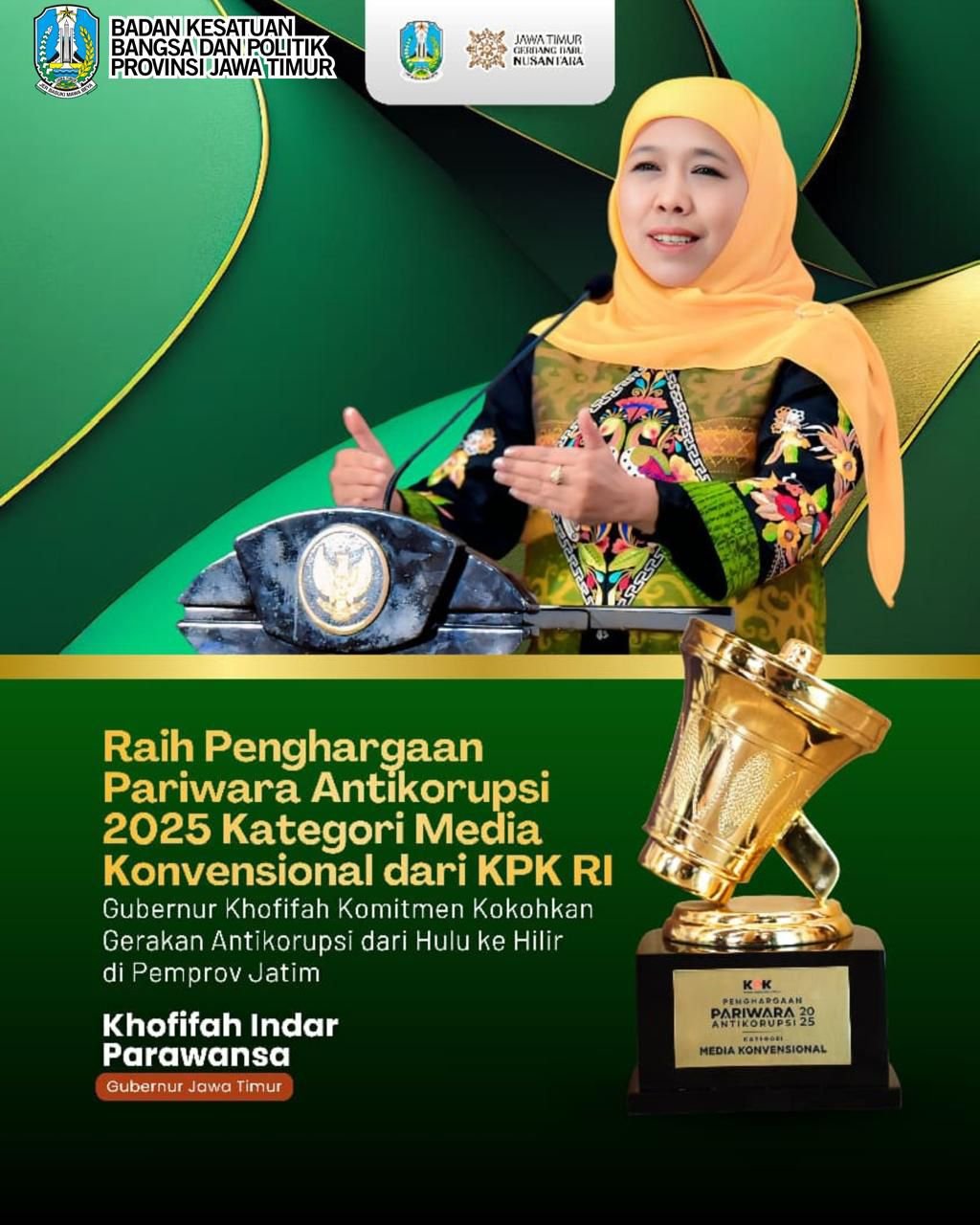 “Alhamdulillah, Pemprov Jawa Timur menerima apresiasi Pariwara Antikorupsi 2025 media konvensional urutan pertama dari KPK RI. Urutan kedua Provinsi DKI Jakarta dan ketiga Kabupaten Demak Jawa Tengah,” ujarnya.